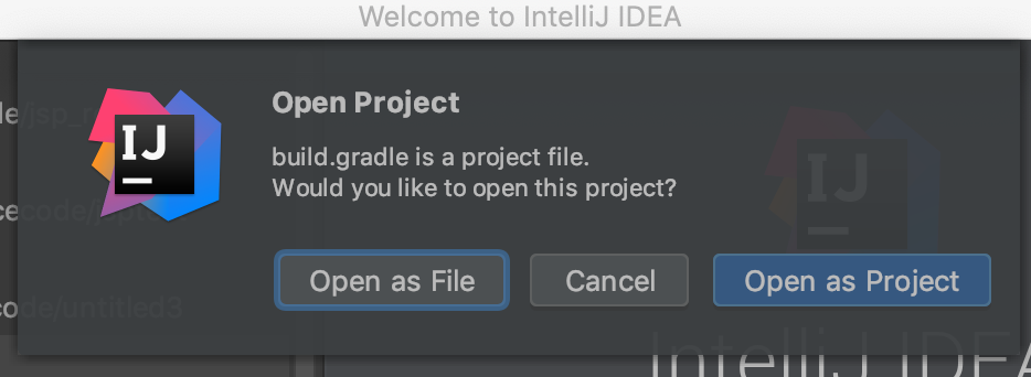 다운받은 폴더 안의 build.gradle 파일을 선택하여 오픈하면 아래와 같이 물어보는 창이 뜨는데, Open as Project 를 선택한다.