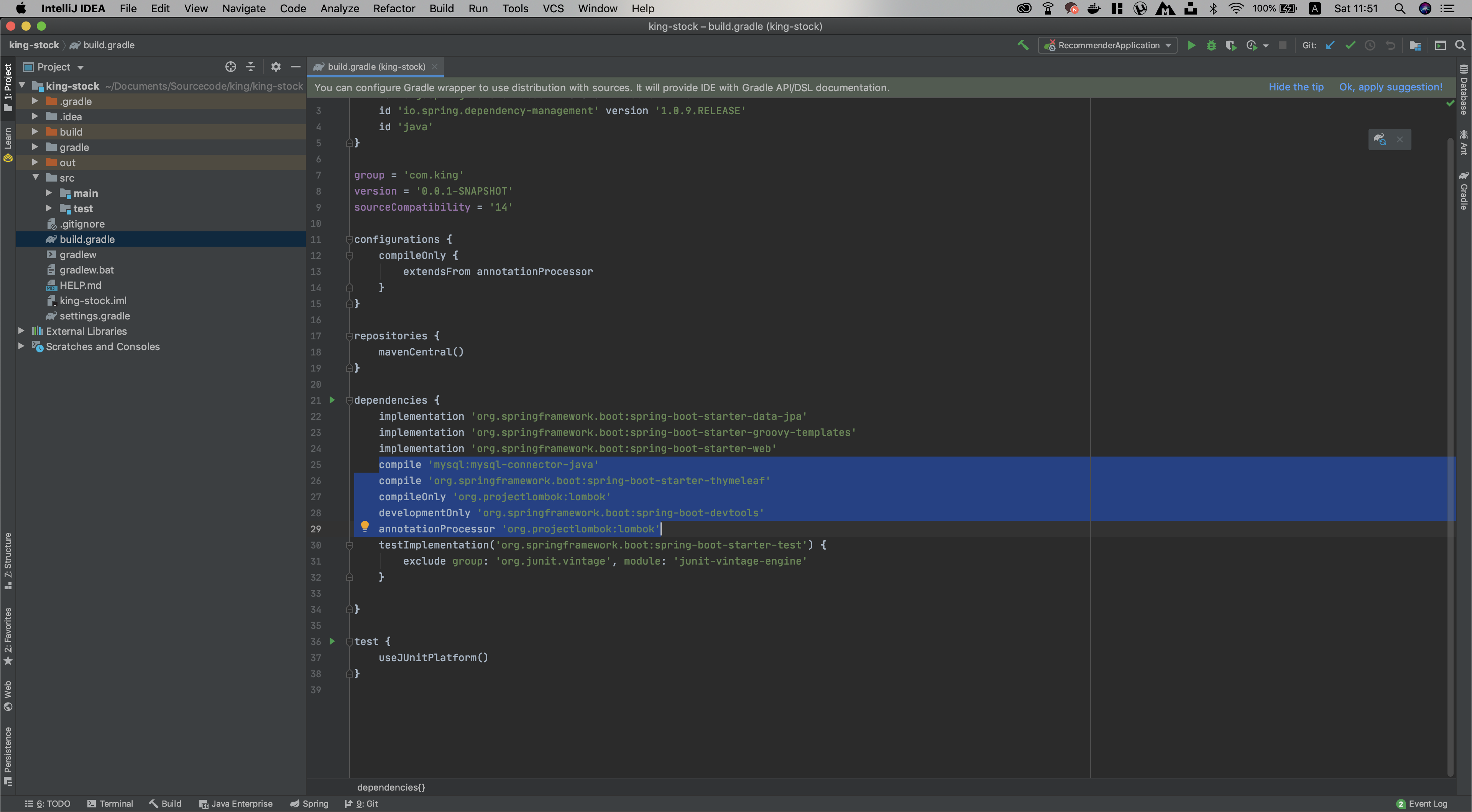dependencies { implementation 'org.springframework.boot:spring-boot-starter-data-jpa' implementation 'org.springframework.boot:spring-boot-starter-groovy-templates' implementation 'org.springframework.boot:spring-boot-starter-web' compile 'mysql:mysql-connector-java' compile 'com.google.guava:guava:29.0-jre' compile 'org.springframework.boot:spring-boot-starter-thymeleaf' compile group: 'com.fasterxml.jackson.core', name: 'jackson-databind' compile group: 'org.apache.commons', name: 'commons-lang3', version: '3.10' compile group: 'org.apache.commons', name: 'commons-collections4', version: '4.4' compileOnly 'org.projectlombok:lombok' developmentOnly 'org.springframework.boot:spring-boot-devtools' annotationProcessor 'org.projectlombok:lombok' testImplementation('org.springframework.boot:spring-boot-starter-test') { exclude group: 'org.junit.vintage', module: 'junit-vintage-engine' } testCompile 'org.spockframework:spock-core:1.2-groovy-2.5' testCompile 'org.spockframework:spock-spring:1.2-groovy-2.5' }그리고 내 프로젝트에 필요한 디펜던시들을 추가해준다.