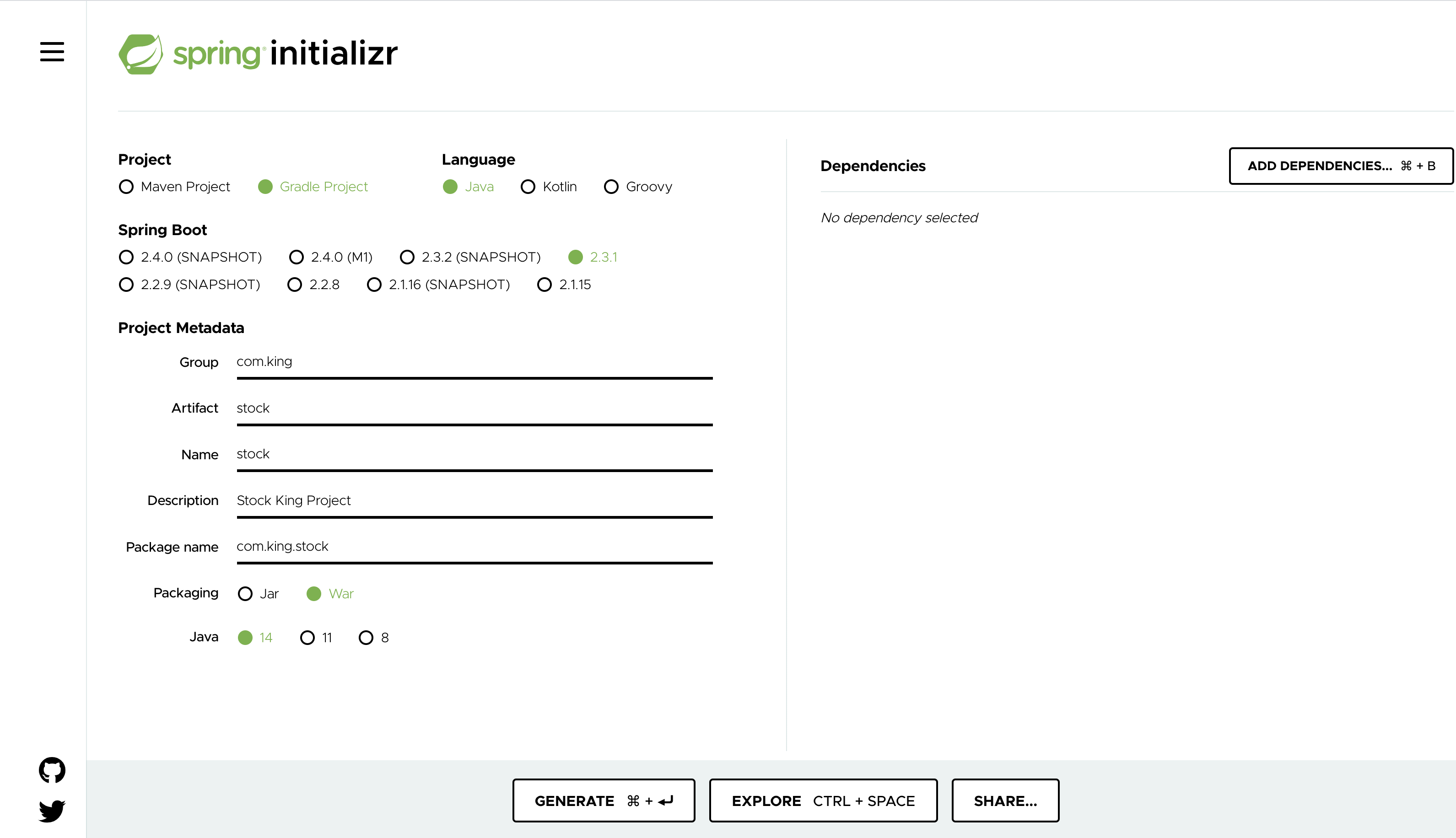 스프링 io에 들어간 후, 아래 창에서 원하는 대로 옵션을 선택한다.