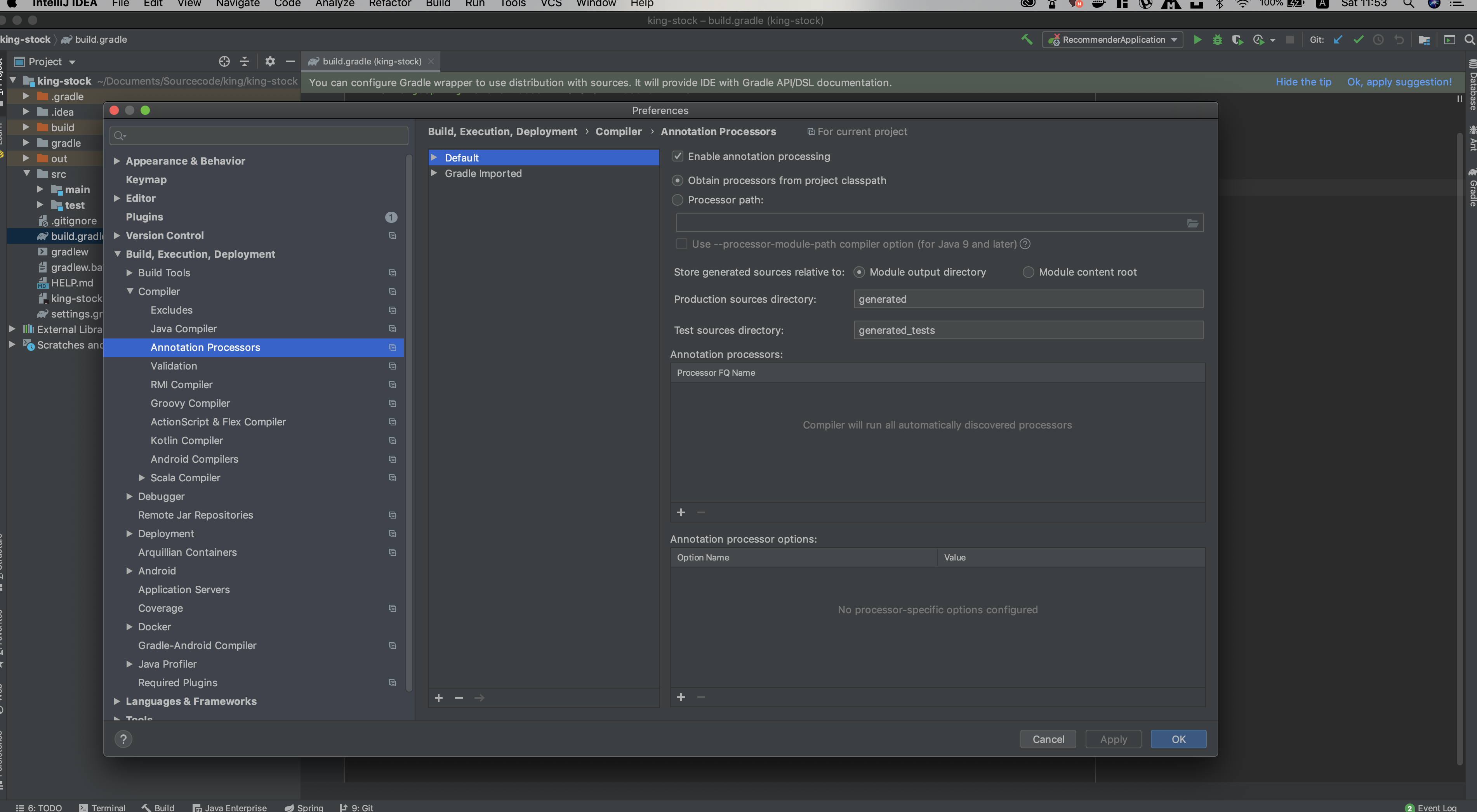 그리고 설정 - Build, Execution, Deployment - Compliler - Annotation Processors 에서 Enable annotation processing 을 활성화시켜준다.