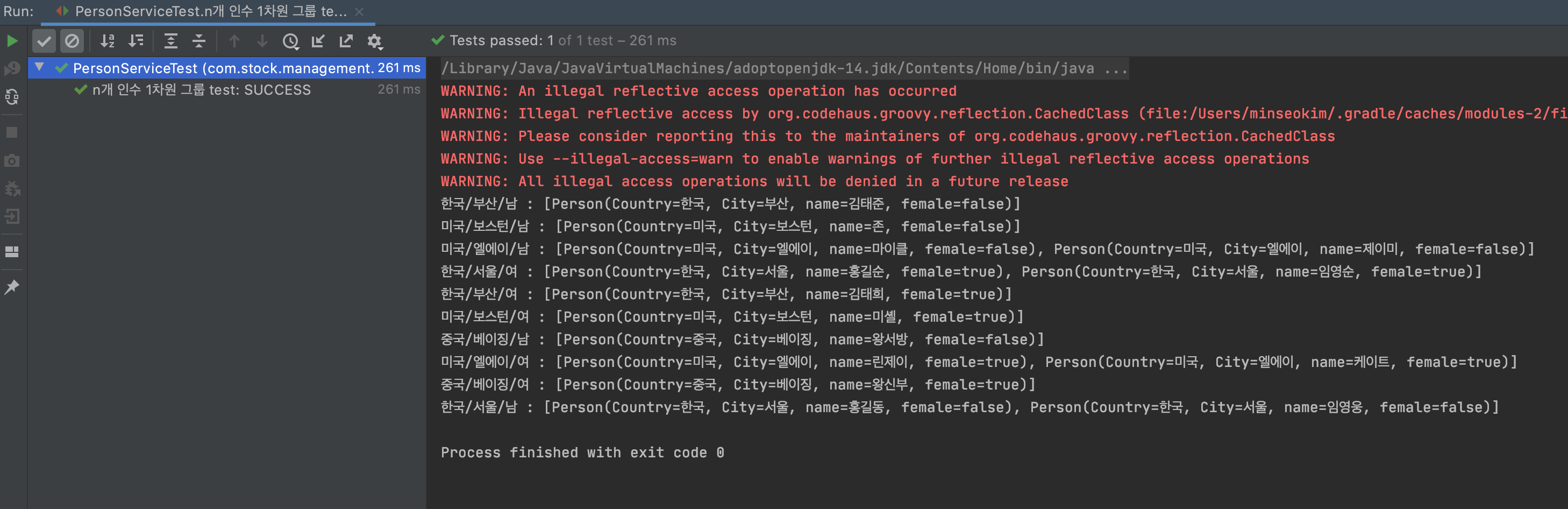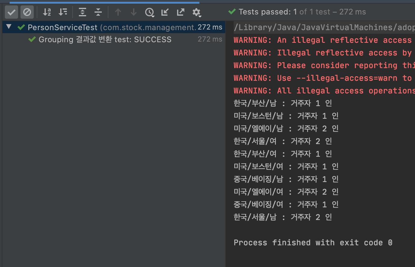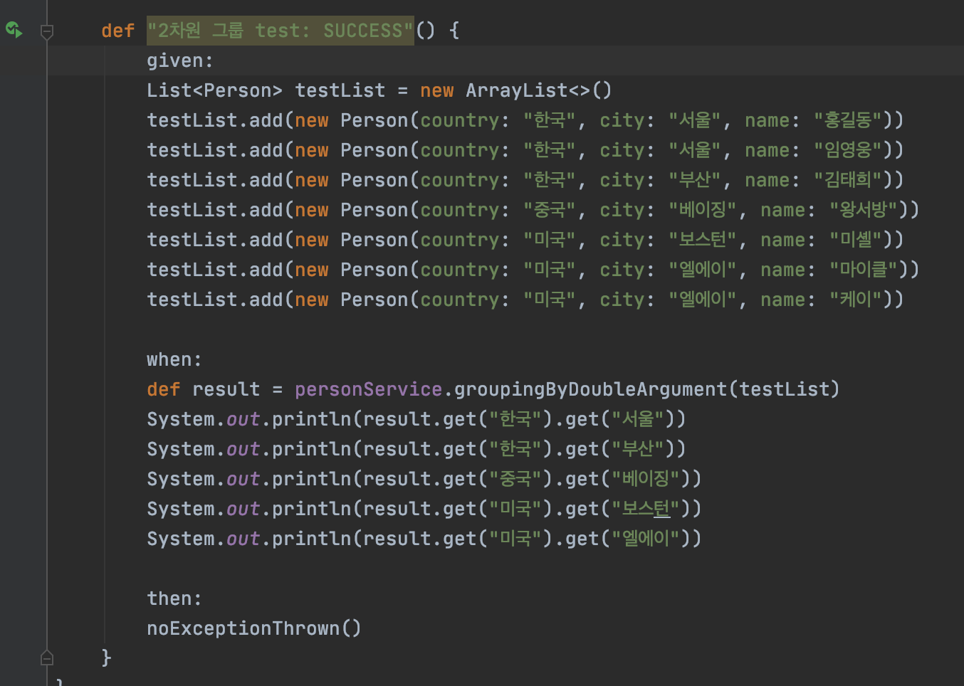 public Map<String, Map<String, List<Person>>> groupingByDoubleArgument(List<Person> people){ return people.stream().collect(Collectors.groupingBy(Person::getCountry, Collectors.groupingBy(Person::getCity))); }마찬가지로 테스트 코드로 잘 그룹화가 되는지 검증해보았다.