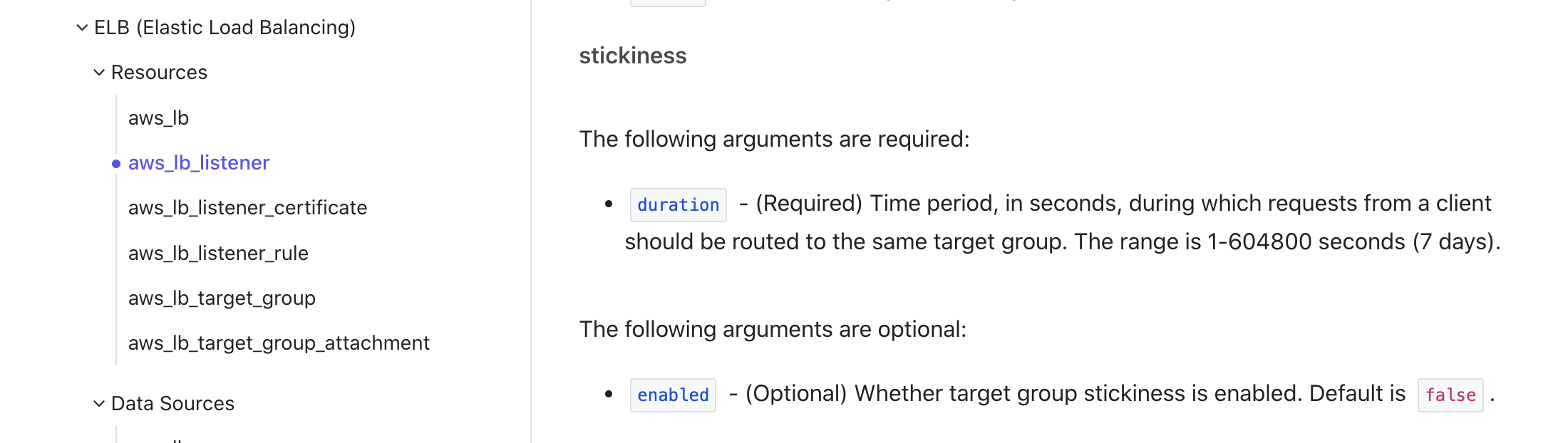 # AWS Application load balancer 정의 resource "aws_lb" "test" { name = "test-lb-tf" internal = false load_balancer_type = "application" security_groups = [aws_security_group.lb_sg.id] subnets = [for subnet in aws_subnet.public : subnet.id] enable_deletion_protection = true access_logs { bucket = aws_s3_bucket.lb_logs.id prefix = "test-lb" enabled = true } tags = { Environment = "production" } } # ALB 의 listen 동작 정의 resource "aws_lb_listener" "front_end" { load_balancer_arn = aws_lb.front_end.arn port = "443" protocol = "HTTPS" ssl_policy = "ELBSecurityPolicy-2016-08" certificate_arn = "arn:aws:iam::187416307283:server-certificate/test_cert_rab3wuqwgja25ct3n4jdj2tzu4" default_action { type = "forward" target_group_arn = aws_lb_target_group.front_end.arn } # aws_lb_target_group 도 정의해주어야 하는데 생략합니다 stickiness { enabled = true duration = 600 } }위의 코드로 ALB 를 정의하고, ALB 의 listen 동작을 정의해주었습니다.