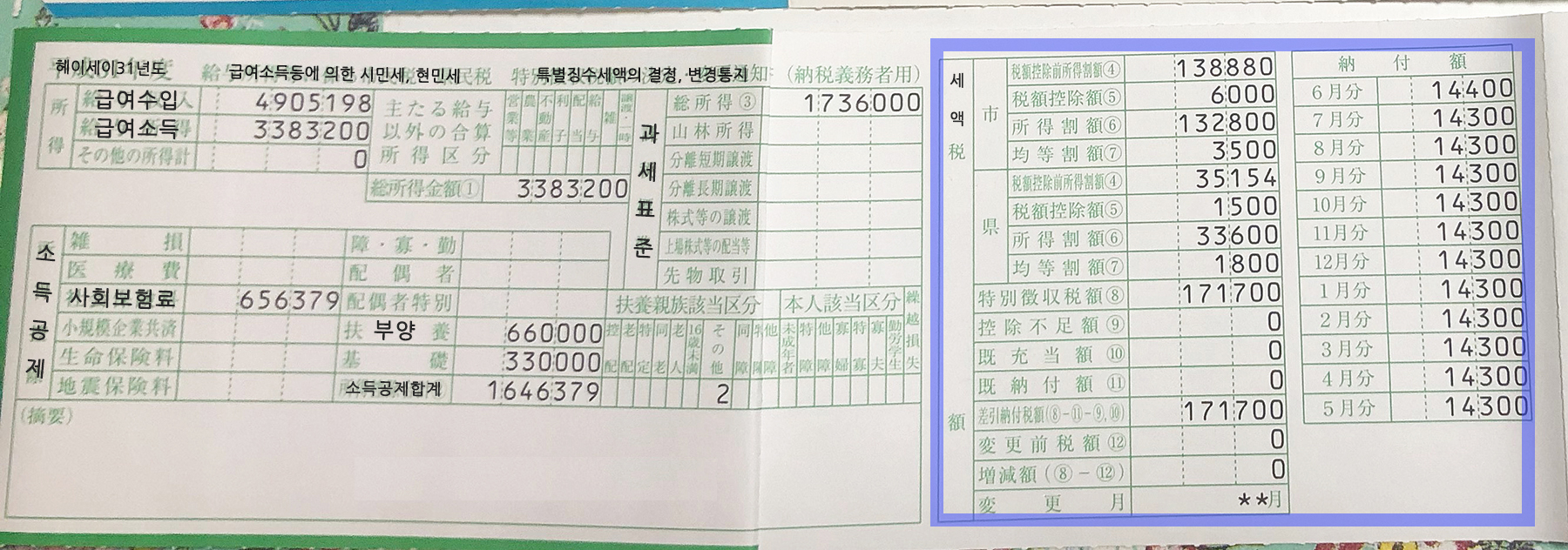 다음 해인 平成31年으로 집계된 소득을 보자. 급여 수입은 4905198엔이고, 세후 소득은 3383200엔으로 잡힌다. 여기에서 추가로 소득 공제를 하는데, 사회 보험료 공제, 의료비 공제, 배우자 공제, 부양 공제, 고향 납세(후루사토 노우제) 등 총 14종류에 걸쳐 소득 공제를 받을 수 있다. 여기에서 해당되는 소득 공제항목인 사회 보험료와 부양 공제액 1646379엔을 세후 소득에서 다시 제외하면, 이 사람의 주민세 과세대상 소득은 1736000엔이 된다. 이 소득에 이 사람이 살고 있는 지자체의 주민세 과세율을 곱하여(전국 표준:10%), 최종 주민세가 나온다. 보라색으로 강조된 표 안에서 이 사람의 최종 주민세 과세액을 확인할 수 있다. 시민세와 현민세를 포함하여 주민세로 1년치 171700엔이 과세되었으며, 이 주민세를 令和1年 6월부터 14300엔씩 12달에 걸쳐 매 달 납부하게 된다.