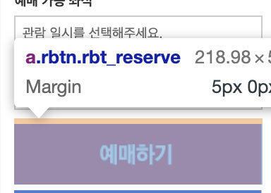 티켓팅 페이지가 로드되면, 예매하기 버튼 element을 찾아서 클릭하게 하겠습니다. 이번에는 id가 아닌 class로 예매하기 element를 찾아오겠습니다.