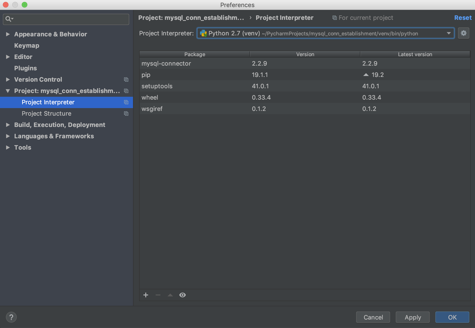 # MySql 8.0 이상 유저 pip install mysql-connector-python # 하위 버전 pip install mysql.connectorPycharm의 경우 프로그램 안에서 라이브러리 설치도 지원한다.