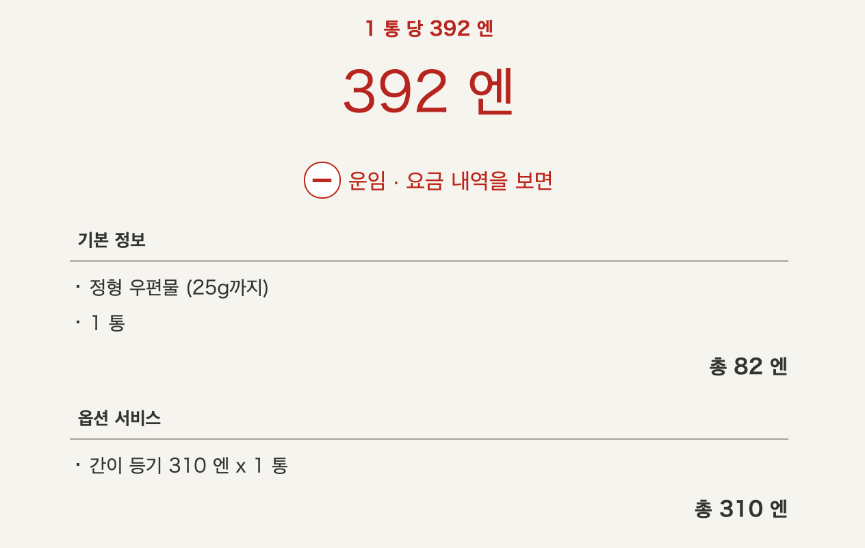 무게 가격 25g 이내 82 엔 50g 이내 92 엔 * 일반 봉투에 편지지 3~4장를 넣어 발송했을 때 무게 25g 이내로 82엔이 나왔습니다.