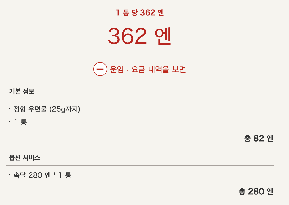 무게 가격 50g 이내 200 엔 100g 이내 220 엔 150g 이내 290 엔 250g 이내 340 엔 500g 이내 500 엔 1kg 이내 700 엔 2kg 이내 1,020 엔 4kg 이내 1,330 엔