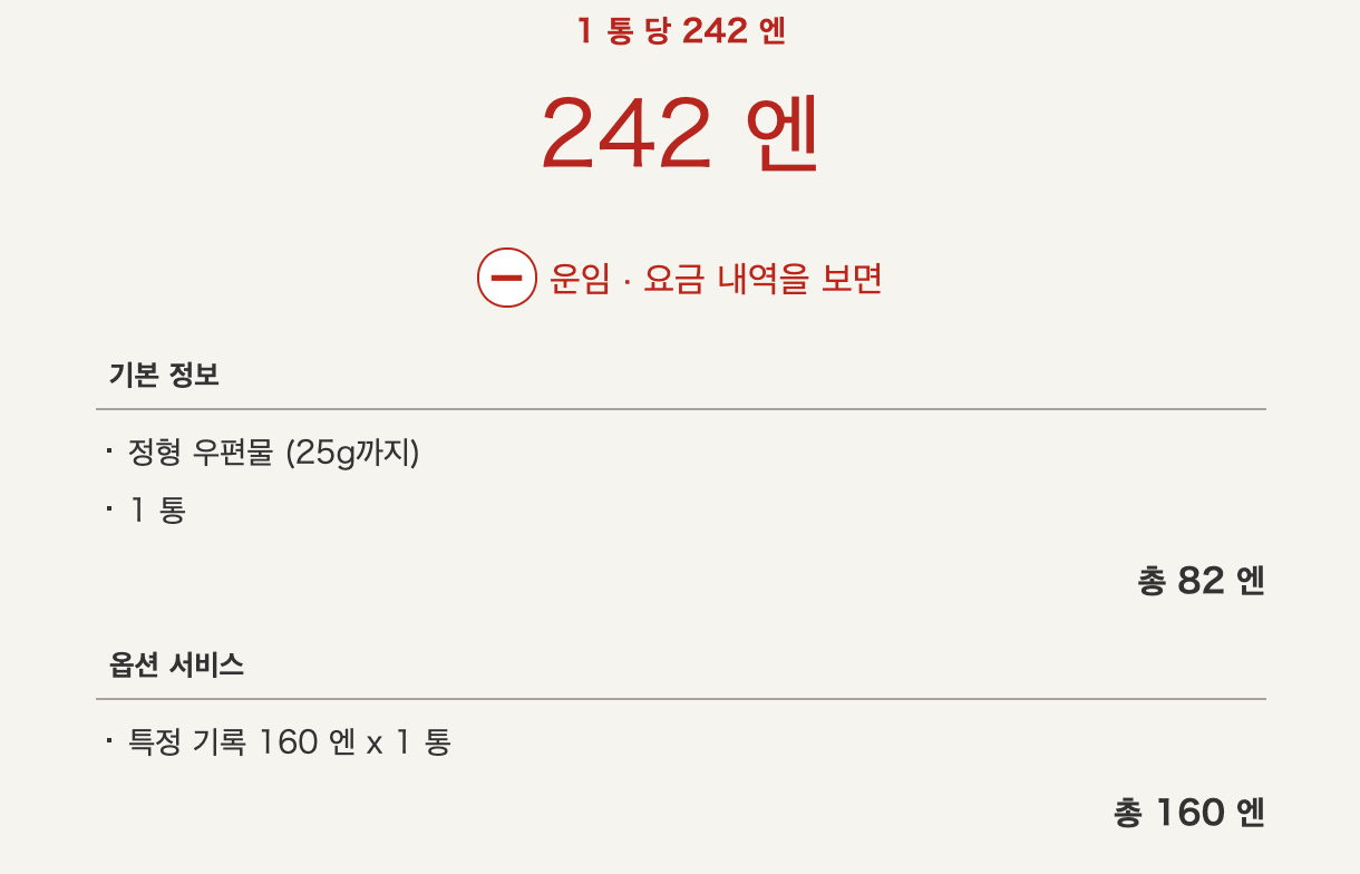 - 인수 기록 옵션을 붙일 경우, 우편물이 인수되기까지의 기록을 인터넷에서 열람 확인 가능합니다. 보상은 되지 않으며, 집배원이 직접 수신인에게 전달하는 게 아니라 수취인의 우체통에 넣게 됩니다. 우편가격에 160엔이 추가됩니다.