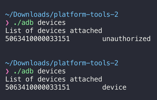 ./adb devices- 이 때 임의의 기계번호와 device 메시지가 뜬다면 잘 되고 있는 것이다.