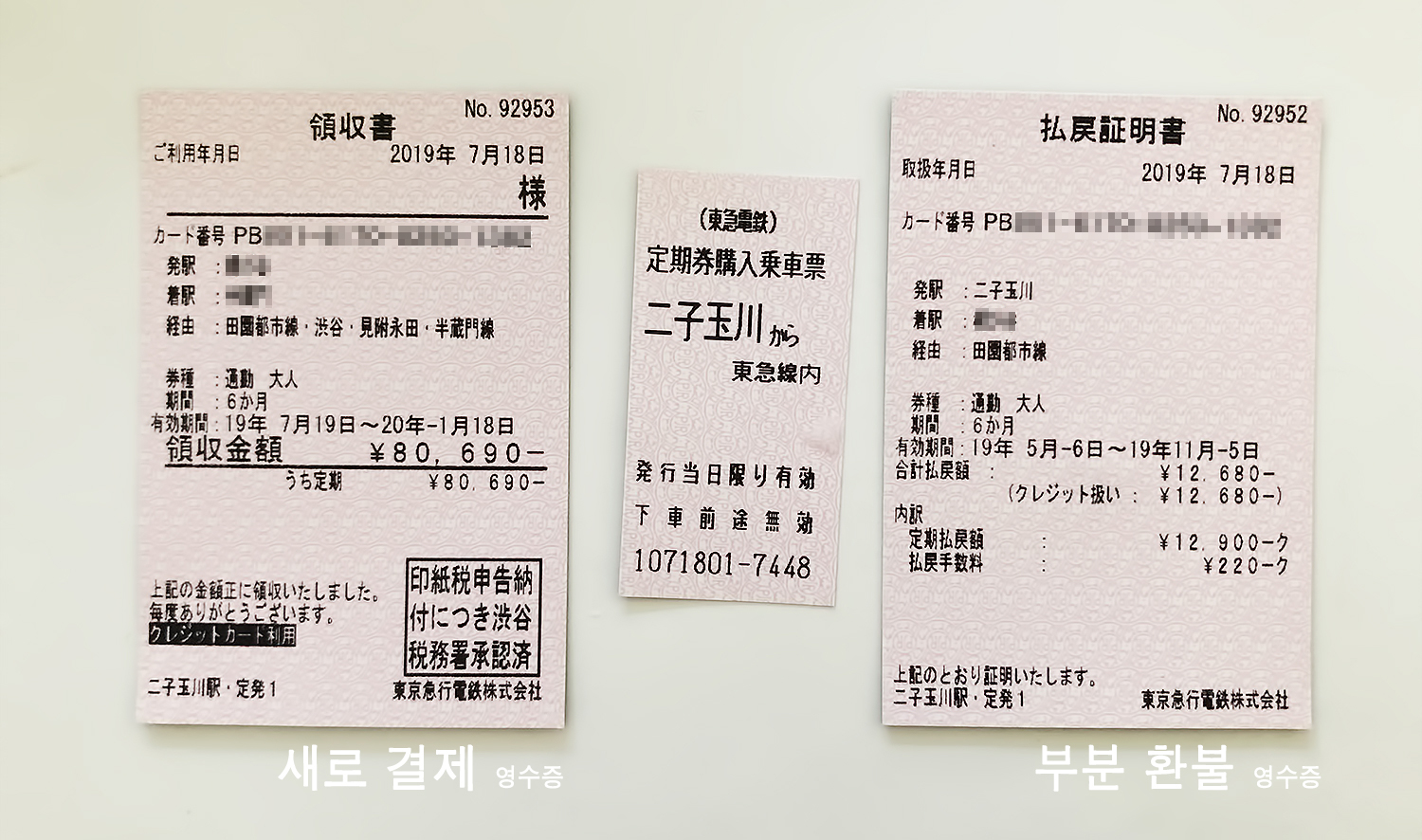 후타코 타마가와역 TOKYU 정기권 판매소 노선 시착역인 후타코 타마가와 역의 TOKYU 정기권 판매처를(東急定期券うりば) 방문하여 환불 수속을 진행하였다. 환불을(払い戻し) 하고 싶다고 이야기하면 서류를 주는데 개인정보등을 작성하고 정기권카드와 신분증을 제출하면 그 자리에서 바로 처리 해준다.