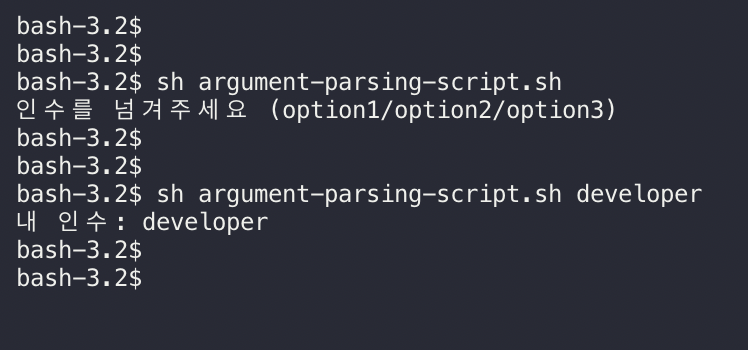 #! /bin/bash if [ $# -lt 1 ] ; then echo '인수를 넘겨주세요 (option1/option2/option3)' exit 1 fi MY_ARGUMENT=`echo $1 | tr '[A-Z]' '[a-z]'`; echo 내 인수: ${MY_ARGUMENT}