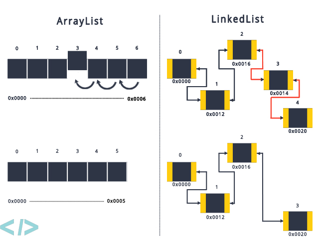어레이 리스트와 연결 리스트 삽입/삭제 오퍼레이션 시간복잡도 어레이 리스트는 인덱스가 순차적으로 존재해야하는 구조 특성상, 한 원소를 삽입/삭제 시 배열의 나머지 원소들의 인덱스 참조값을 수정해야 하게 된다. 따라서 추가/삭제 오퍼레이션의 시간 복잡도는 O(n)이 된다. 위의 그림의 어레이 리스트 배열을 보자. 총 6개의 인덱스를 가지던 배열에서 3번 원소를 삭제하면, 4, 5, 6번째 원소는 각각 3, 4, 5번으로 수정되어야 하므로 한 칸씩 당겨진다.