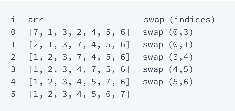 [7, 1, 3, 2, 4, 5, 6] 이라는 arr 배열을 입력받았을 때, arr[0] 과 arr[3]를 자리 교환, (i=0 에서 7과 2가 자리를 바꾸었다) arr[0] 과 arr[1]를 자리 교환, ...., 최종적으로 arr[5], arr[6]을 자리 교환하여 [1, 2, 3, 4, 5, 6, 7] 으로 정렬이 완료되었다. 정렬 되기까지의 최소 교환 횟수는 5번으로, 5를 리턴한다.